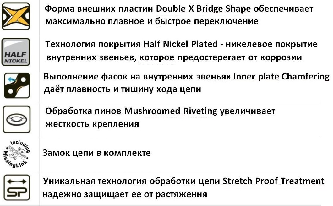 Внутренние пластины с фасками улучшают стабильность цепи. «X»-образная поверхность внешней пластины для совместимости с любыми звездами Цепь дополнительно покрыта никелем для защиты от коррозии. Попробуйте оценить новое качество цепей KMC. Великолепное сочетание качества материала, изготовления и цены.
