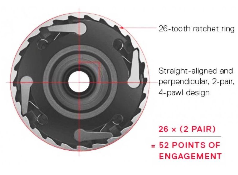 - Технология DOUBLE TIME ™. Прямолинейная конструкция с 4 собачками превращает кольцо с храповым механизмом с 26 зубцами в 52 точки контакта. Результат: плавное зацепление под углом 6,9 градуса без уменьшения размера зуба (смещения внутренней геометрии), что означает серьезную долговечность.