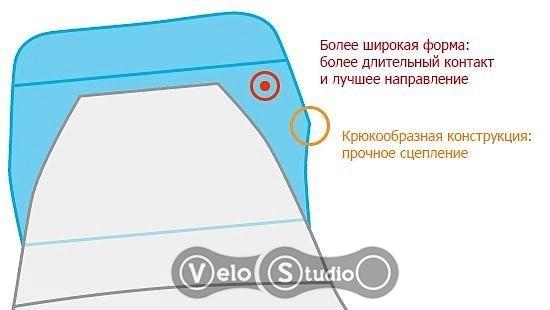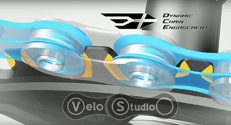 Ширші зубці передніх зірок забезпечують більш тривалий контакт ланцюга з передньою зіркою і кращий напрямок. Конструкція зубця також виконана у вигляді гака. Спеціальна форма дозволяє ланцюгу міцніше зачіплюватись за передню зірку. Таким чином, Dynamic Chain Engagement+ збільшує міцність зчеплення на 150%. Імовірність зіскакування ланцюга повністю виключається.